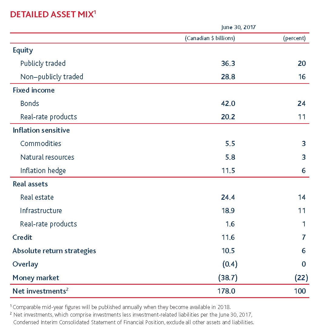 Gross asset return in local currency was 4.5%. The Plan invests in 37 global currencies and in more than 50 countries, but reports its assets and liabilities in Canadian dollars. In the first half of 2017 the appreciation of the Canadian dollar had an impact of - 0.8%, or -$1.4 billion, on the Plan's total-fund gross return.