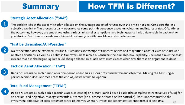 In summary, TFM is distinctly different from other asset allocation approaches. For TFM, decisions are made each period (continuous assessment) on a multi-period ahead basis (the complete term structure of ERs) for an optimal end objective. It manages outcomes (an outcome-oriented policy portfolio). It does not compromise the investment objective for plan-design or other objectives. As such, it avoids the hidden cost of suboptimal allocations.